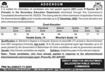 Only male candidates can apply for Balochistan Public Service Commission Jobs In Balochistan December 2025 Qualification /Experience Required:Qualification: a) Bachelor’s Degree in Computer Science (4 years)/BS (IT) at least in Second Division from HEC recognized University. Age Limit: 18 to 28 years and general upper age relaxation up to 43 years granted by the Government of Balochistan for fresh candidates as well as government servants and more experienced candidates should apply before 03 December 2025.