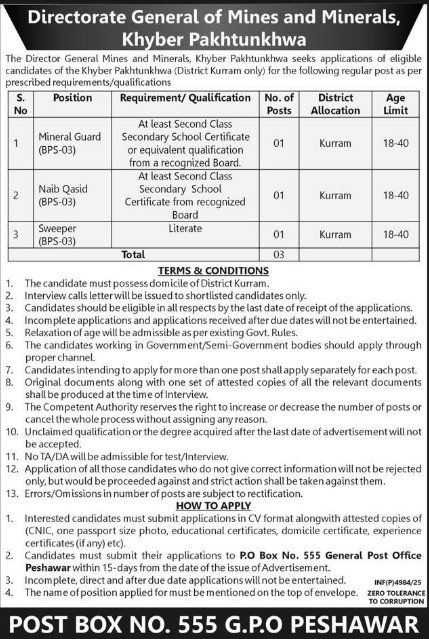 Only male candidates can apply for GenerOf Mines And Minerals Jobs In KPK December 2025 Qualification /Experience Required:At least Second Class Secondary School Certificate or equivalent qualification from a recognized Board. At least Second Class Secondary School Certificate from a recognized Board, Literate and more experienced candidates should apply before 25 December 2025.