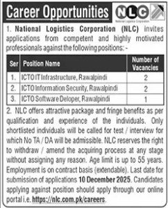 Candidates, if you are seeking National Logistics Corporation Jobs 2025 Online Application, yes. Then it would help if you tried to complete the National Logistics Corporation Jobs because here you can easily apply for these vacancies: ICTOIT Infrastructure, Rawalpindi, ICTO Information Security, Rawalpindi, ICTO Software Developer, Rawalpindi.