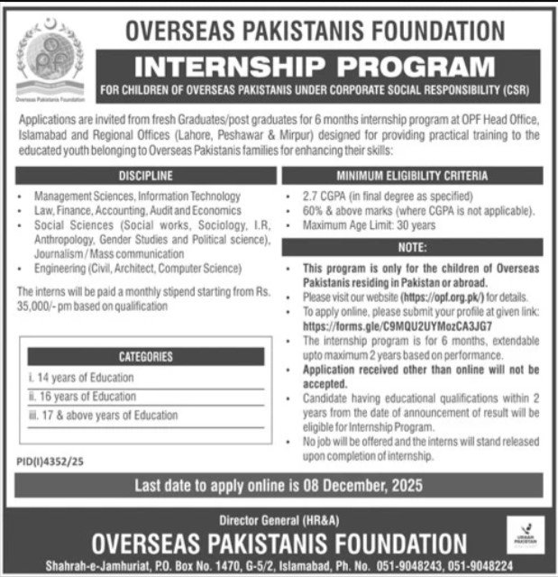 Candidates if you are seeking Overseas Pakistan Foundation Jobs In Islamabad December 2025 if yes. It would be best if you tried to complete read Overseas Pakistan Foundation job because you can easily apply for these vacancies INTERNSHIP PROGRAM.