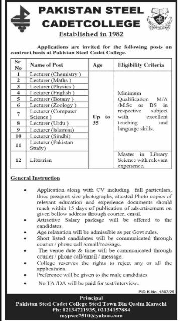Only male candidates can apply for Pakistan Steel Cadet College Jobs In Karachi, December 202.5 Qualification /Experience Required:Minimum Qualification M/A/M.Sc or BS inrespectiv ewithsubject excellentteachin and language skills Master in Library Science with relevant experience, and more experienced candidates should apply before 25 november 2025.