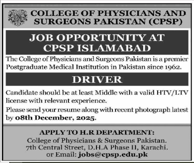 Only male candidates can apply for the College Of Physicians and Surgeons Pakistan Jobs In Karachi December 2025. Qualification /Experience Required: Candidate should be at least Middle with a valid HTV/LTV license with relevant experience and more experienced candidates should apply before 08 December 2025.